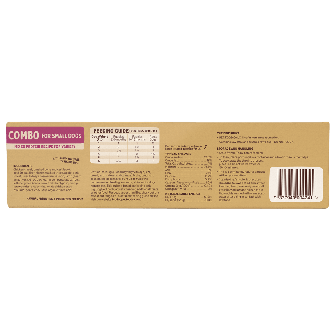 Big Dog's Combo for Small Dogs is minced finer than our regular recipes for little tummies and comes in half size patties perfect for smaller eaters. With more tasty forms of protein than your dog could dream of, this combination of high-quality RSPCA-approved chicken, all-Aussie beef and pork, ocean fresh Tasmanian salmon and pasture-raised lamb truly is a mouthful!