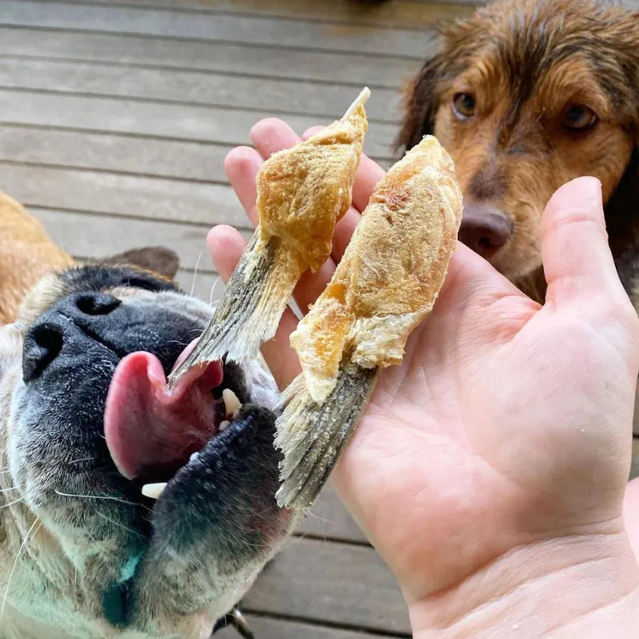 We recommend our salmon bellies for recreational chewing, which is good for dental health. They are not diced and vary in size as they are 100% natural product. They are both belly meat and fin, and super crunchy.