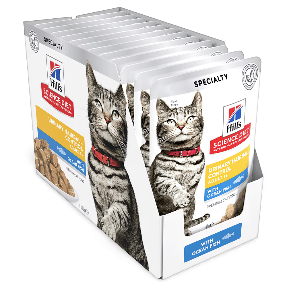 Hill's Science Diet Adult Urinary Hairball Control Ocean Fish Cat Food Pouches provide science-led, precisely balanced nutrition. Designed by vets, this formula supports urinary health with optimal magnesium and uses natural fibre to help reduce hairballs in adult cats.