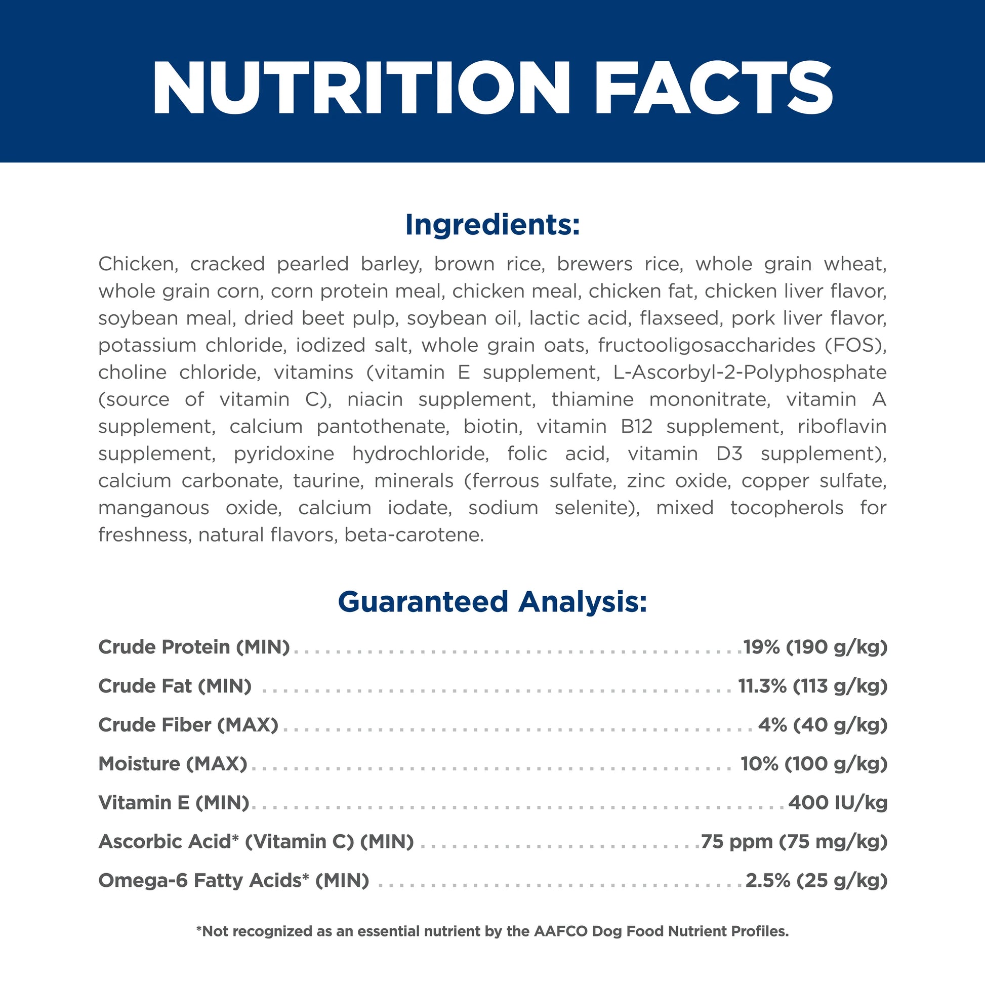 Chicken, Cracked Pearled Barley, Brown Rice, Brewers Rice, Whole Grain Wheat, Whole Grain Corn, Corn Protein Meal, Chicken Meal, Chicken Fat, Chicken Liver Flavor, Soybean Meal, Dried Beet Pulp, Soybean Oil, Lactic Acid, Flaxseed, Pork Liver Flavor, Potassium Chloride, Iodized Salt, Whole Grain Oats, Fructooligosaccharides (FOS), Choline Chloride, vitamins (Vitamin E Supplement, L-Ascorbyl-2-Polyphosphate (source of Vitamin C), Niacin Supplement, Thiamine Mononitrate, Vitamin A Supplement, Calcium Pantothenate, Biotin, Vitamin B12 Supplement, Riboflavin Supplement, Pyridoxine Hydrochloride, Folic Acid, Vitamin D3 Supplement), Calcium Carbonate, Taurine, minerals (Ferrous Sulfate, Zinc Oxide, Copper Sulfate, Manganous Oxide, Calcium Iodate, Sodium Selenite), Mixed Tocopherols for freshness, Natural Flavors, Beta-Carotene.