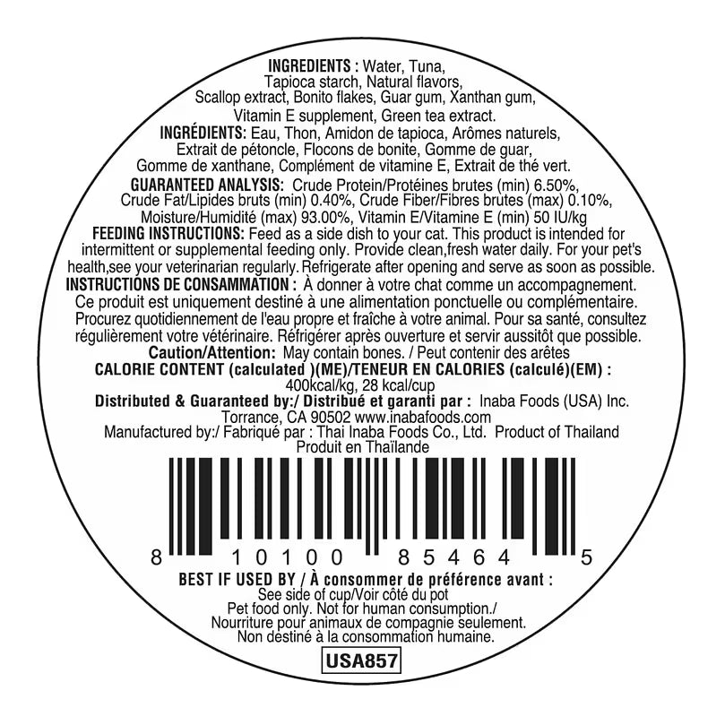 Water, Tuna, Tapioca starch, Natural flavors, Scallop extract, Bonito flakes, Guar gum, Xanthan gum, Vitamin E supplement, Green tea extract.