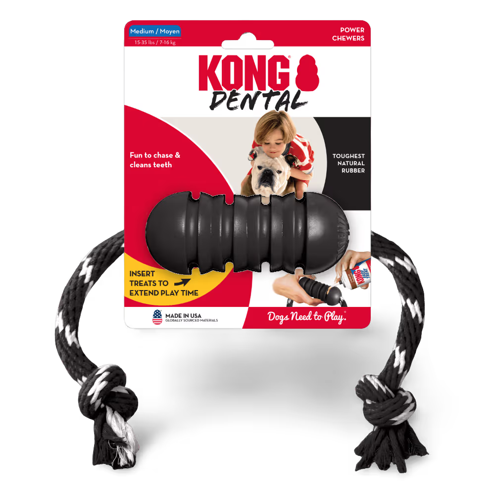 The KONG Extreme Dental with Rope toy is the ultimate chew and play companion for dogs who demand toughness in their toys. Perfect for power chewers, it integrates a durable rubber design with a cotton rope for enhanced dental health.