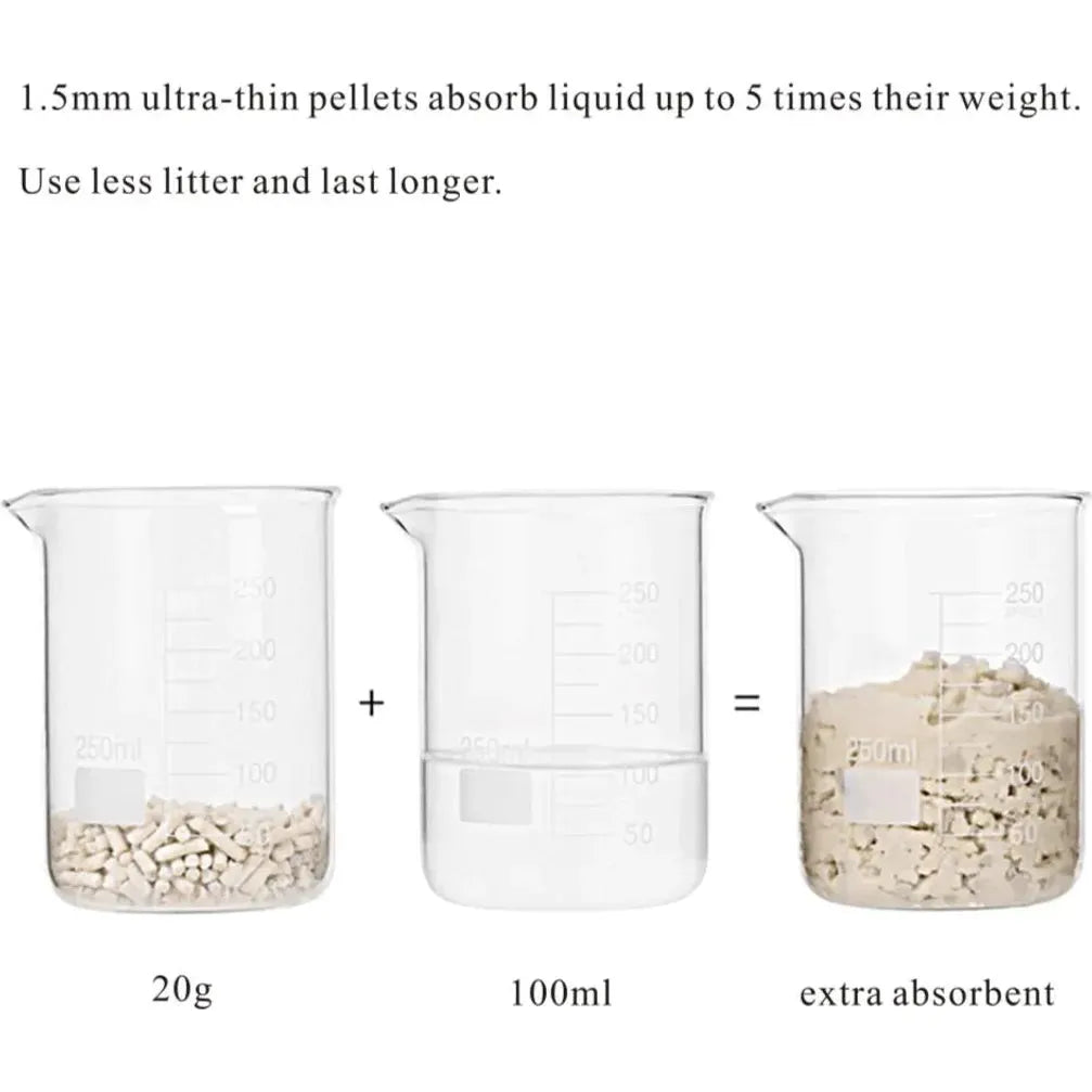 - Extra Absorbent: 5mm ultra-thin pellets absorb liquid up to 5 times their weight; Use less litter and last longer