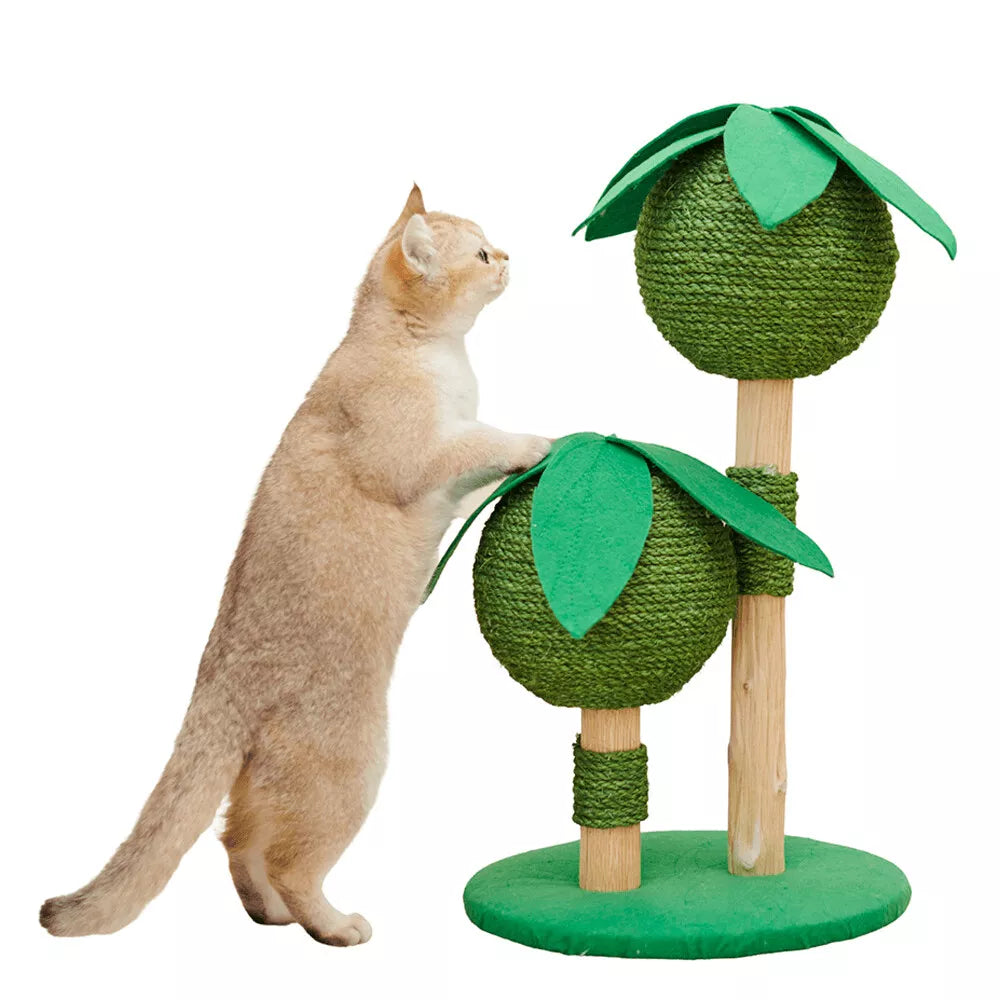 This uniquely designed cat tree is crafted from solid wood, sisal rope, and cotton. With its tropical-themed appearance and multiple scratching balls, your cat will delight in exploring, scratching, and perching on this distinctive addition to their home.