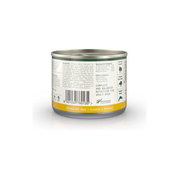 Deboned Chicken, Water Sufficient for Processing, Lamb Liver, Lamb Lung, Lamb Green Tripe, Lamb Heart, Lamb Kidney, New Zealand Green Mussel, Dried Yeast, Carrot, Cassia Gum, Agar-Agar, Salmon Oil, Calcium Carbonate, Guar Gum, Potassium Chloride, Choline Chloride, Taurine, Iron Proteinate, Zinc Glycine Complex, Niacin Supplement, Alpha-Tocoperol Acetate, Selenium Yeast, Manganese Proteinate, Copper Glycine Complex, Thiamine Mononitrate, Calcium Pantothenate, Riboflavin, Pyridoxine Hydrochloride, Vitamin A Acetate, Biotin, Vitamin B12 Supplement, Calcium Iodate, Folic Acid,