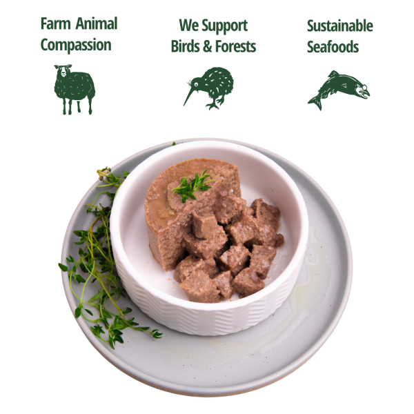 This kitten wet cat food is produced in New Zealand, using proteins sourced from Free-Range/Run, Wild, or Sustainable practices.