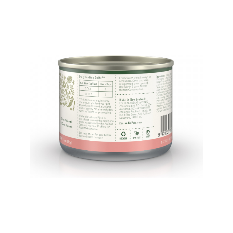 Deboned Salmon, Water Sufficient for Processing, Lamb Liver, Lamb Lung, Lamb Green Tripe, Lamb Heart, Lamb Kidney, New Zealand Green Mussel, Dried Yeast, Carrot, Cassia Gum, Agar-Agar, Salmon Oil, Calcium Carbonate, Guar Gum, Potassium Chloride, Choline Chloride, Taurine, Iron Proteinate, Zinc Glycine Complex, Niacin Supplement, Alpha-Tocoperol Acetate, Selenium Yeast, Manganese Proteinate, Copper Glycine Complex, Thiamine Mononitrate, Calcium Pantothenate, Riboflavin, Pyridoxine Hydrochloride, Vitamin A Acetate, Biotin, Vitamin B12 Supplement, Calcium Iodate, Folic Acid, Cholecalciferol.