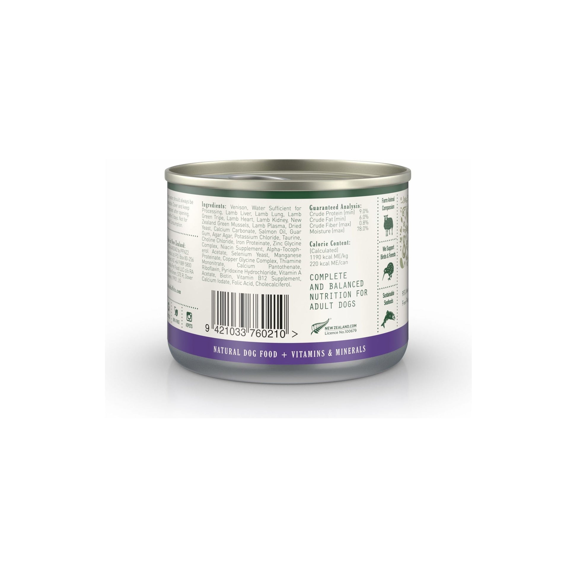 Deboned Venison, Water Sufficient for Processing, Lamb Liver, Lamb Lung, Lamb Green Tripe, Lamb Heart, Lamb Kidney, New Zealand Green Mussel, Dried Yeast, Carrot, Cassia Gum, Agar-Agar, Salmon Oil, Calcium Carbonate, Guar Gum, Potassium Chloride, Choline Chloride, Taurine, Iron Proteinate, Zinc Glycine Complex, Niacin Supplement, Alpha-Tocoperol Acetate, Selenium Yeast, Manganese Proteinate, Copper Glycine Complex, Thiamine Mononitrate, Calcium Pantothenate, Riboflavin, Pyridoxine Hydrochloride, Vitamin A Acetate, Biotin, Vitamin B12 Supplement, Calcium Iodate, Folic Acid, Cholecalciferol.